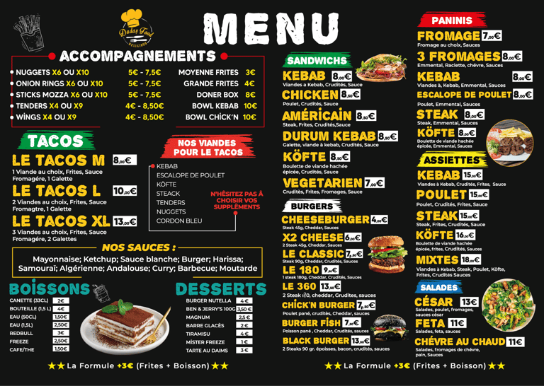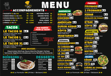 Découvrez notre menu savoureux de kebabs, tacos et burgers de qualité avec des ingrédients frais. (Halal)