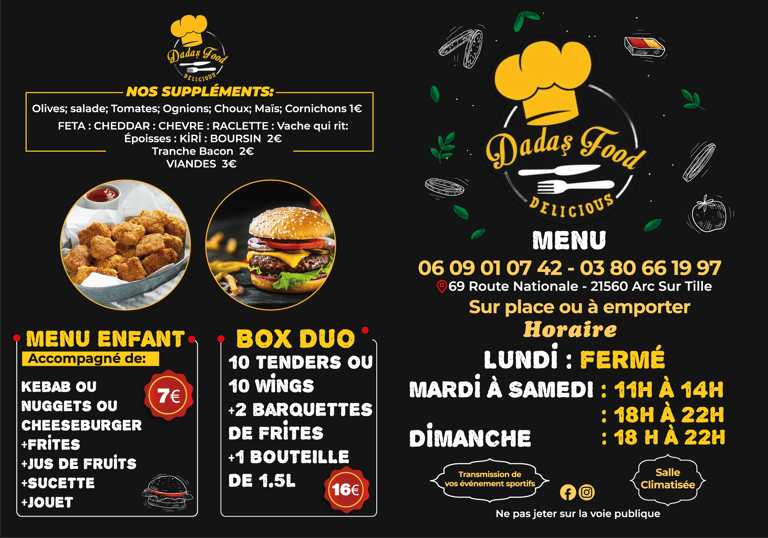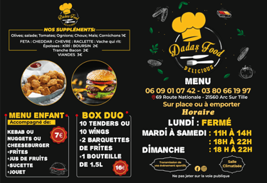 Dadas Food, un restaurant familial à Arc-sur-Tille, vous offre des kebabs, tacos et burgers avec des ingrédients frais et savoureux.